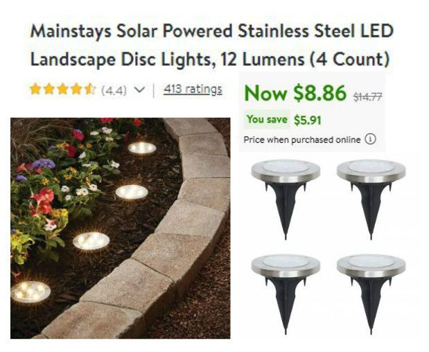 Mainstays Solar Powered Stainless Steel LED Landscape Disc Lights, 12 Lumens (4 Count) $8.86 (reg $14.77)