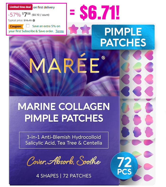 MAREE Pimple Patches with Hydrocolloid Acne Patches w/Salicylic Acid, Tea Tree Oil & Centella, Pack of 72 for $7.45 (Reg $16.45)