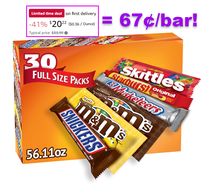 Mars M&M’S, SNICKERS, 3 MUSKETEERS, SKITTLES & STARBURST Variety Pack, Full Size, 30 Count for $23.79 (Reg $33.99)