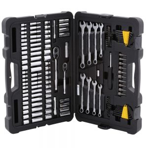 - Includes 1/4 in. drive pear-head ratchet, 3/8 in. drive pear-head ratchet, 1/4 in. drive 6 in. extension bar, 3/8 in. drive 3 in. extension bar, 3/8 in. drive universal joint, (20) 3/8 in. drive 6-point sockets, (19) 1/4 in. drive 6-point sockets, (16) 1/4 in. drive 6-point deep sockets, (7) 3/8 in. drive 6-point deep sockets, (5) 3/8 in. drive 12-point sockets, (3) 3/8 in. drive 6-point spark plug sockets, (12) combination wrenches, (16) hex keys (SAE and metric), (30) 1/4 in. drive specialty bits, (10) nut bits, 1/4 in. spinner handle, 1/4 in. bit holder and blow-molded storage case