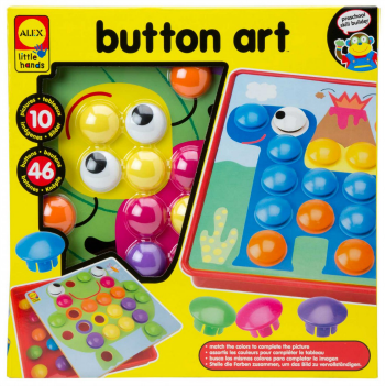 This toy is all buttoned up! Button Art is a great way for young children to develop hand-eye coordination and fine motor skills. Match and snap the chunky buttons to complete the picture. The buttons are thick and wide to make it easy for little hands to hold. There are over 40 buttons and 10 pictures. Also includes a wide storage tray. Part of the Little Hands Skill Builder series by ALEX.