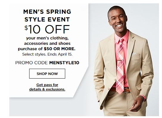 - MENSTYLE10 – $10 Off $50 Men’s Select Styles ends 4/15