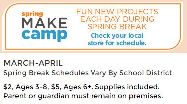 Plus, check out their Spring Make Camp. For $2 to $5, your kids can make a fun new project each day during spring break! The cost covers the cost of all supplies, so your kids can have fun while you shop!