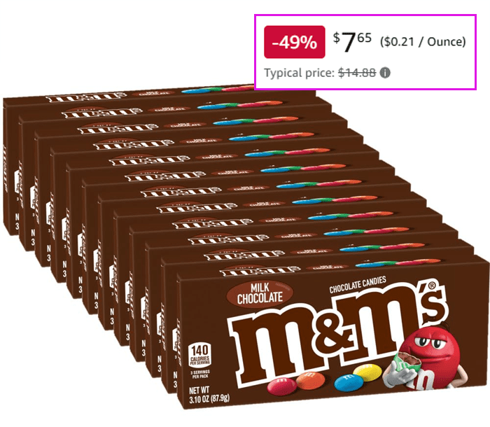 M&M’s Milk Chocolate Candy Movie Theater Box, 3.10 Ounce (Pack of 12) for $9 (Reg $14.88)