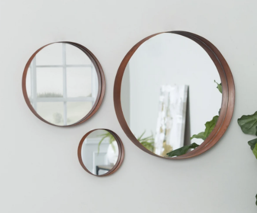 Mix and match this set of three, rustic brushed metal wall mirrors any way you like. Use these copper-framed, circle mirrors to check your hair as you leave the house, or make them vanity mirrors in your main bathroom.