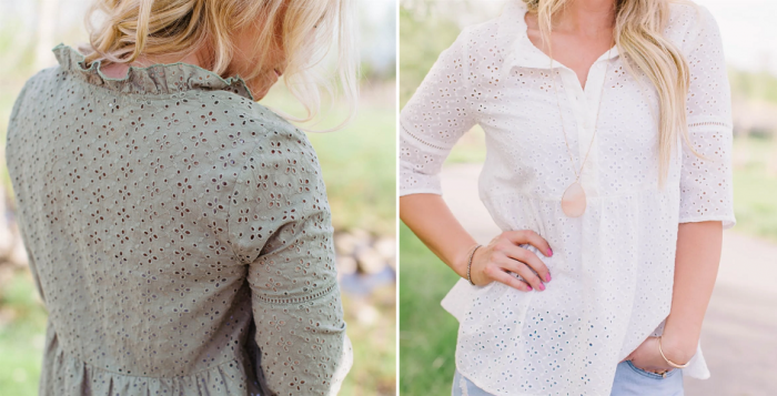 What a pretty top with its dainty floral eyelets! It comes in 4 colors in sizes XS-3XL.