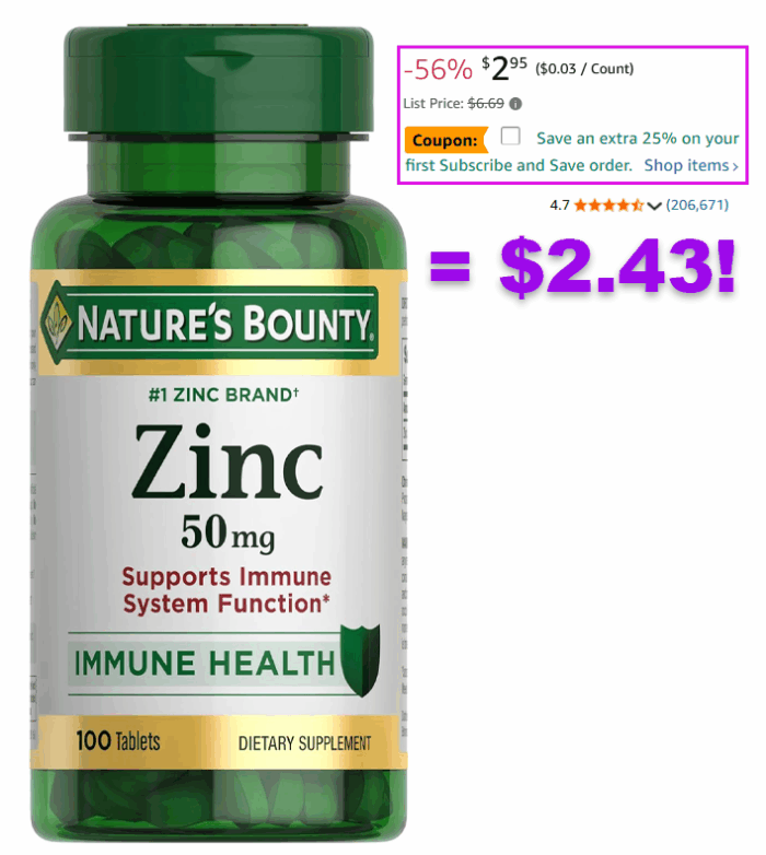 Nature’s Bounty Zinc 50mg, 100 Caplets for $3.47 (Reg $6.69)!