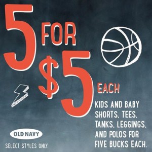 Through tomorrow, August 3, Old Navy is having a 5 for $5 sale on select kids and baby shorts, tees, tanks, leggings and polos. This is a great way to get some back to school shopping done! The selection is GREAT!