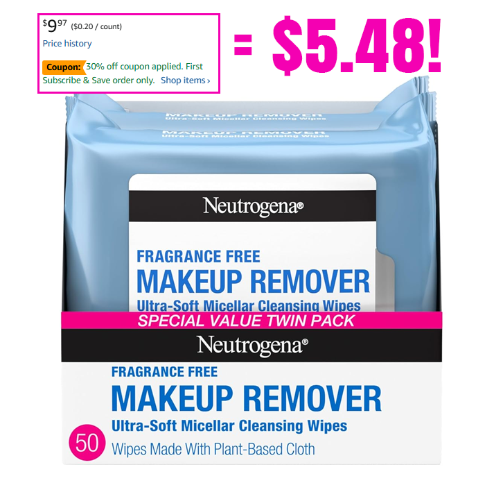 Neutrogena Fragrance-Free Makeup Remover Wipes, Twin Pack, 2 x 25 ct for $5.48 (Reg $9.97)