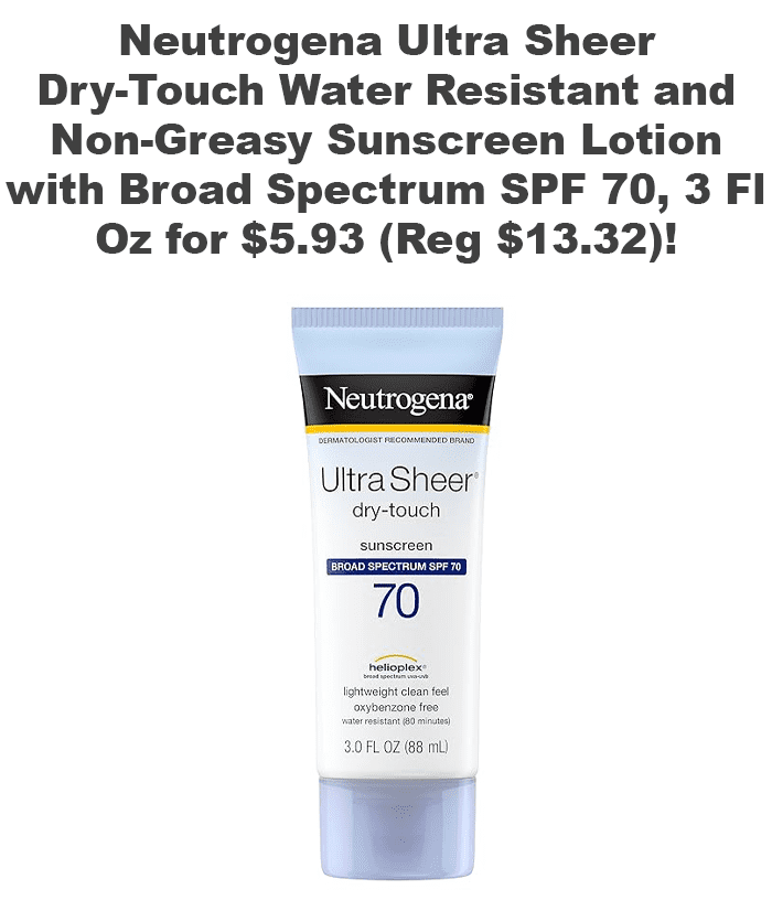 Neutrogena Ultra Sheer Dry-Touch Water Resistant and Non-Greasy Sunscreen Lotion with Broad Spectrum SPF 70, 3 Fl Oz for $8.88 (Reg $13.32)!
