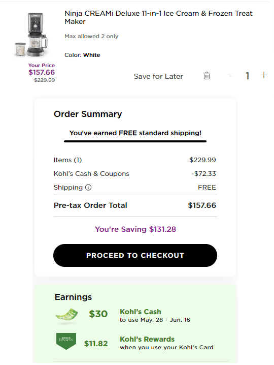 - Pay $157.66 + Earn $30 in Kohl’s Cash + shipping is free.