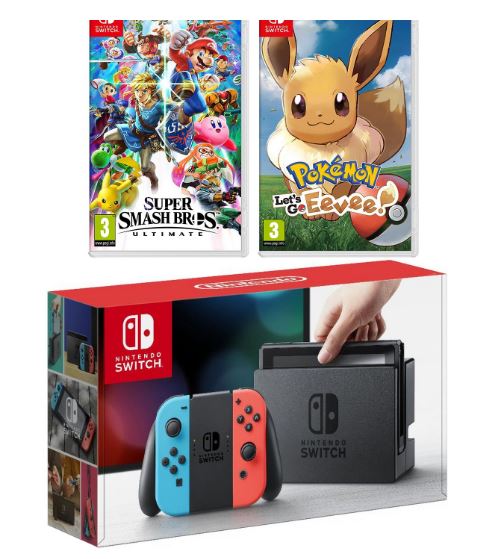 Nintendo Switch with Neon Blu/Red Joycon Controllers, Super Smash Bros and Pokemon Let’s Go Eevee! for $419.95