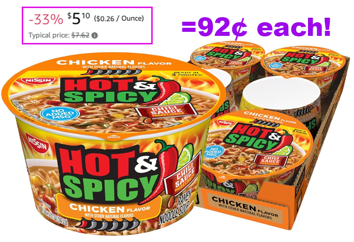 Nissin Hot & Spicy Ramen Noodle Soup, Chicken, 3.32 Ounce (Pack of 6) for $6 (Reg $7.62)!