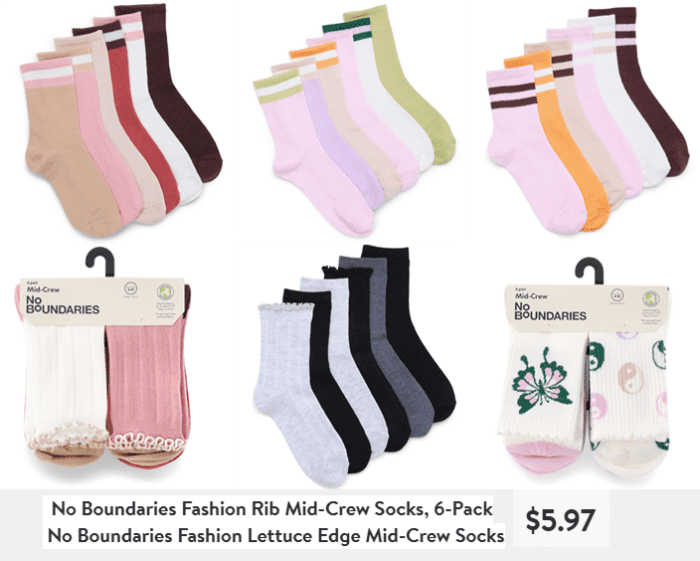 No Boundaries Women’s Fashion Mid-Crew Socks, 6-Pack for $5.97!