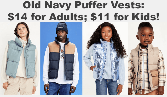 Old Navy Puffer Vests: $14 for Adults; $11 for Kids!
