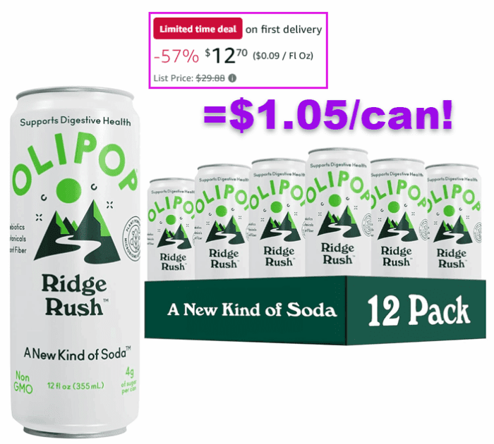 OLIPOP Sparkling Prebiotic Soda, Ridge Rush, 12oz Sleek Can (12 Pack) for $12.70 (Reg $29.88)!
