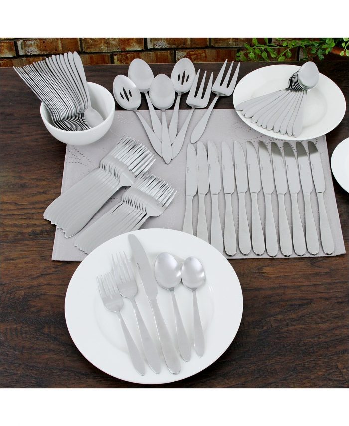 This huge flatware set includes 12 each of salad forks, dinner forks, dinner knives, soup spoons and teaspoons. Plus you’ll receive 12 extra teaspoons and 2 each of serving spoons, pierced serving spoons and serving forks. These are stainless steel and dishwasher safe.