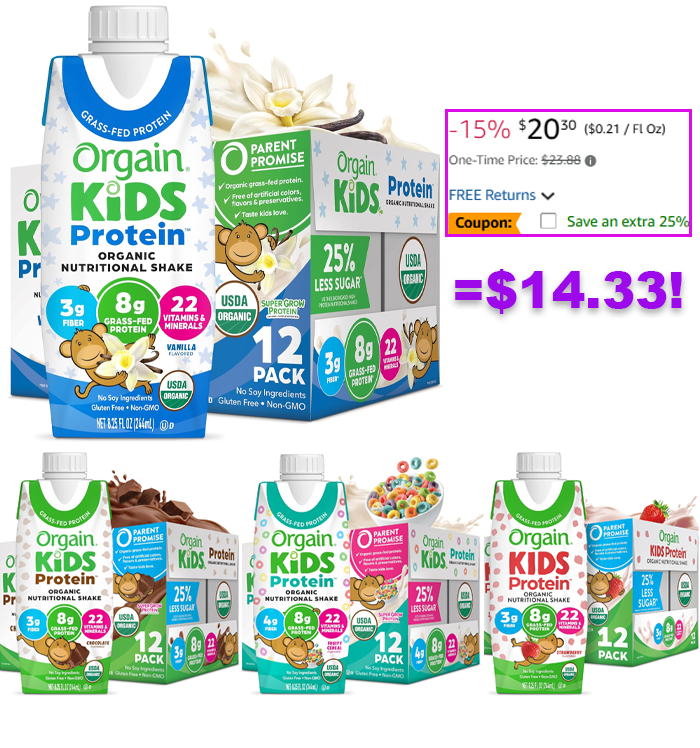Orgain Organic Kids Nutritional Protein Shake (Pack of 12) from $23.88 *Vanilla is the best price, but the coupon is available for all 4 flavors*