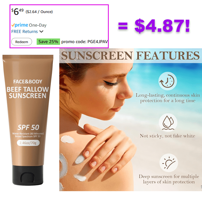 Organic Face & Body Beef Tallow Sunscreen for $6.49