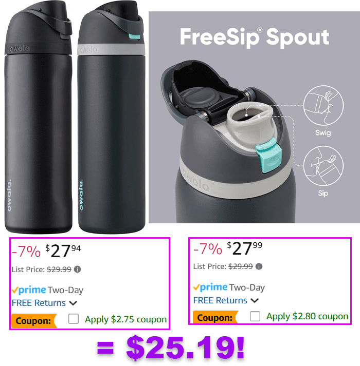 Owala FreeSip Insulated Stainless Steel Water Bottle, 24 Oz, Foggy Tide for $27.99 – $2.80 e-coupon = $25.19 (reg $29.99)