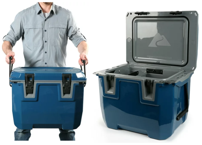 - Ozark Trail 35 quart capacity hard sided cooler’s premium insulation and rugged construction are complemented by a whole range of features including a waterproof (IP65 rating) interior light that detaches to use as a flashlight, freezer grade gasket, stainless steel locking plate with built-in bottle opener, easy open cam latches, an interior bin with handle, anti-skid feet, beverage bar and more! Tough and ready for action, this cooler will really take you places. Premium insulated cooler keeps ice for days