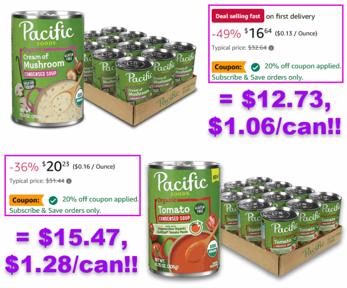 Cream of mushroom soup is the best for fall casseroles! There’s also a good deal on tomato soup with the coupon. This is a great price for Pacific Foods Organic soups!