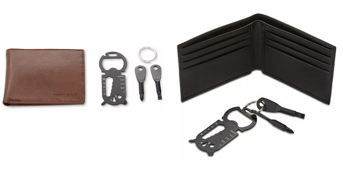 These sets include one bifold wallet, one keychain, and three keychain tools (one multipurpose flat tool, one flat-head screw, and one Philips-head screw).