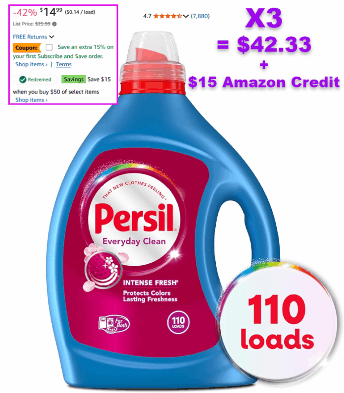 - Pay $42.33 or $47.62, plus earn a $15 Amazon Credit. That’s like paying as low as $27.33, or $9.11 each, only 8.3¢/load!