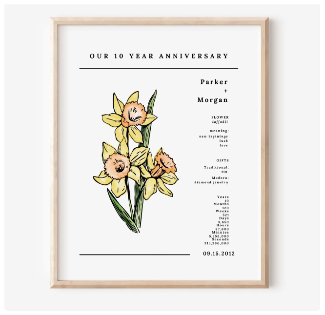 Personalize with this one-of-a-kind anniversary gift to celebrate the years of bliss. Each print has a little info about your special year.