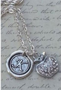 - Show your teacher how much you appreciate her with one of these personalized necklaces! Just pick her initial and choose her style out of either a blinged-out apple charm or a ruler charm with an apple. Both choices are silver-plated and feature a 24” chain. It’s sure to be a gem she’ll treasure forever!