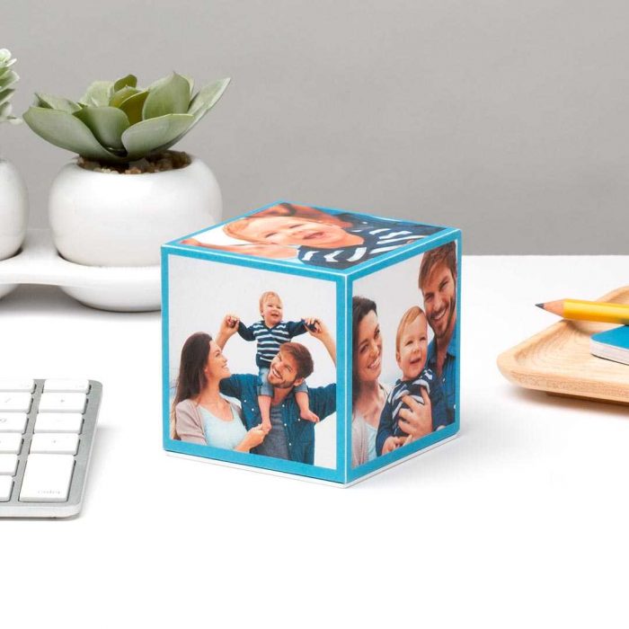 - Photos printed on subtle pearl paper and adhered to a lightweight wood cube
