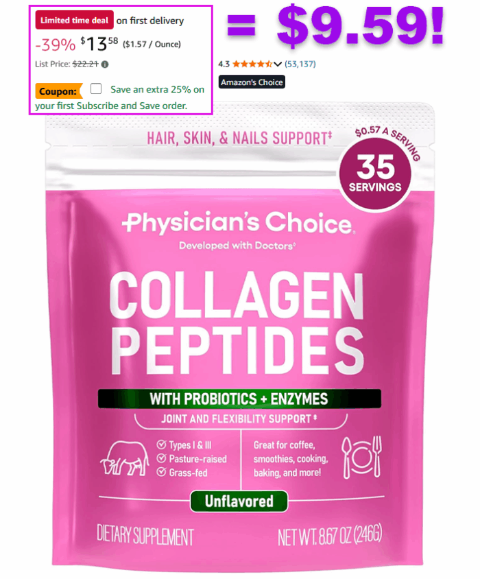 Physician’s CHOICE Collagen Peptides – Hydrolyzed Protein Powder for Hair, Skin, Joints for $15.98 (Reg $22.21)