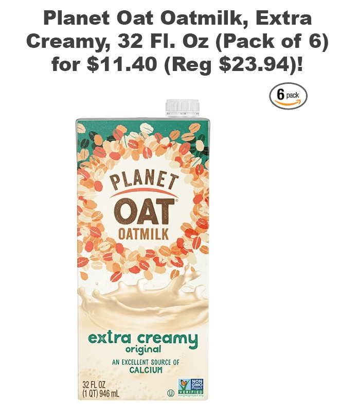 Planet Oat Oatmilk, Extra Creamy, 32 Fl. Oz (Pack of 6) for $12 (Reg $23.94)!