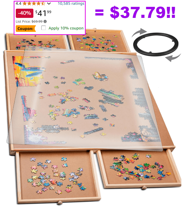 I have this puzzle board and it is so nice to be able to put away the puzzle when we aren’t working on it. The cover and drawers also keep curious kitties from stealing puzzle pieces!