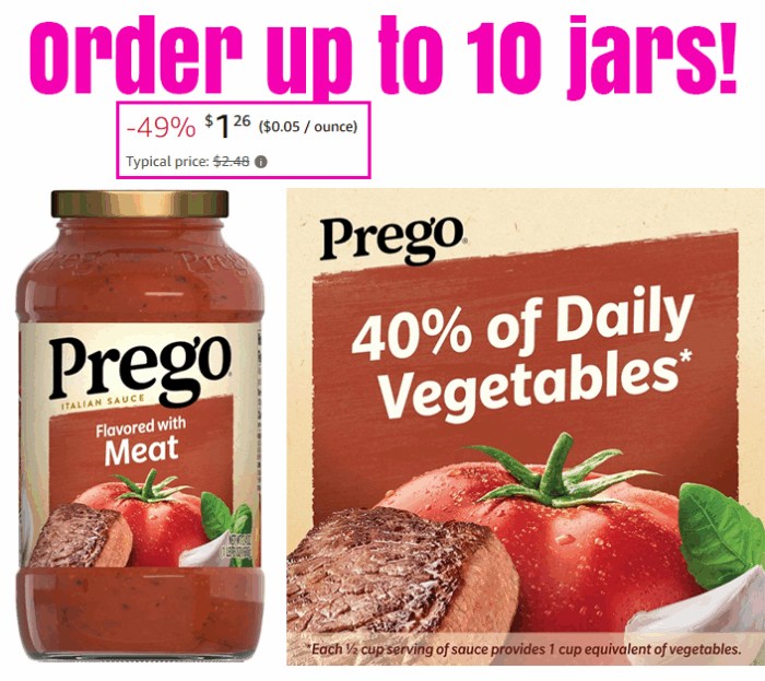Prego Pasta Sauce, Italian Tomato Sauce with Meat, 24 Ounce Jar for $1.48 (Reg $2.48)!