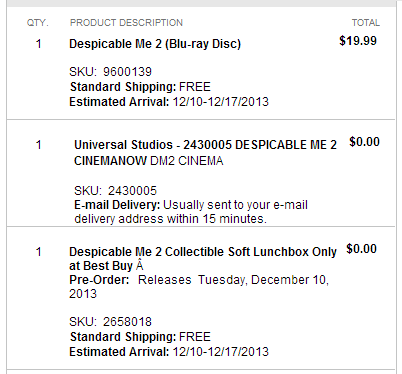 despicable me lunch boxWhen you go to your cart, you’ll see that this Despicable Me 2 Collectible Soft Lunchbox (exlusive at Best Buy) has automatically been added to your order for FREE!