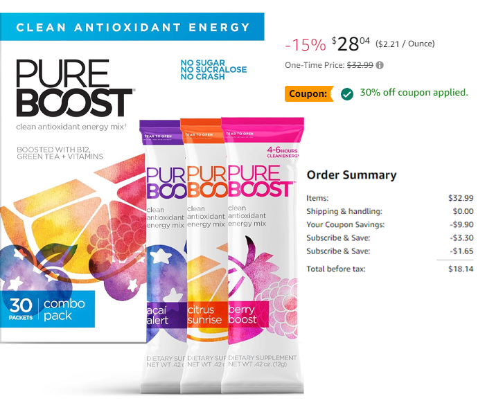 Pureboost Clean Antioxidant Energy Drink Mix, 30 Count for $32.99