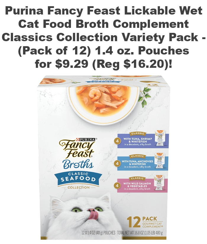 Purina Fancy Feast Lickable Wet Cat Food Broth Complement Classics Collection Variety Pack – (Pack of 12) 1.4 oz. Pouches for $13.27 (Reg $16.20)!