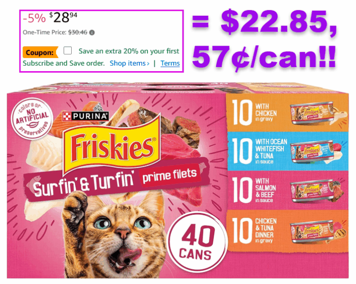 Purina Friskies Gravy Wet Cat Food Variety Pack, Surfin’ and Turfin’ Prime Filets Favorites – (Pack of 40) 5.5 oz. Cans for $22.85 (Reg $30.46)