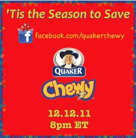 Today, the Quaker Chewy Granola Bars Facebook page announced,” Join us on Monday 12/12 at 8 PM ET for a fan-exclusive coupon right here on Facebook! You won’t want to miss this delicious deal.”