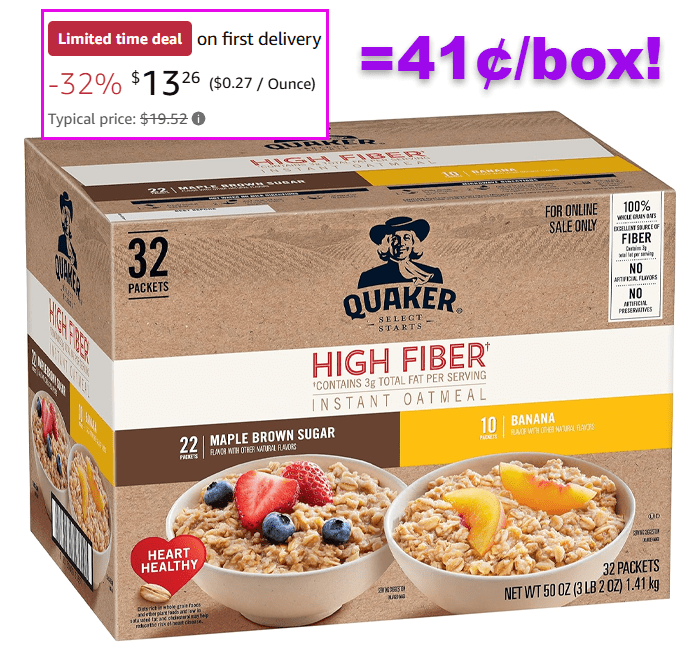Quaker Instant Oatmeal, High Fiber 2 Flavor Variety (32 Pack) for $15.60 (Reg $19.52)