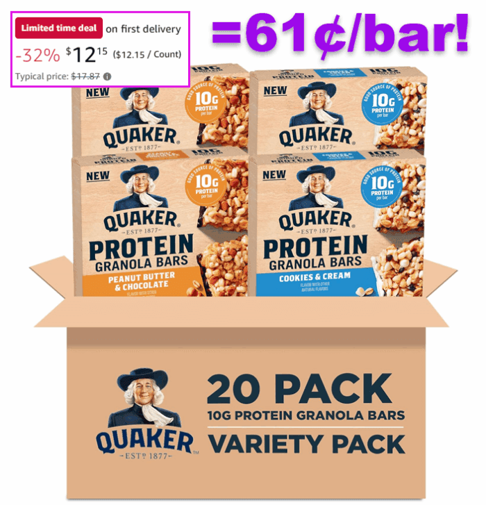 Quaker Protein Granola Bars, 2 Flavor Variety Pack, 10g Protein, 1.41 oz Bars, 20ct for $14.29 (Reg $17.87)!
