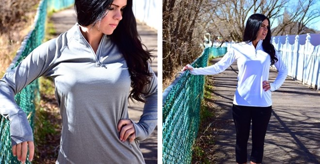 These 1/4 Zip Tech Jackets are perfect for the transitioning weather. Use them for running or pair with jeans or shorts for a casual, comfortable look. I love the long sleeves…that would make it super easy to tie around my waist if I got warm while running with it. And the thumb hold is just super cool. 🙂