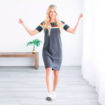 We are absolutely head over heels for this new Rainbow Midi! The rainbow striped design on the upper portion of the dress paired with the relaxed t-shirt fit makes our dress a must-have this season!