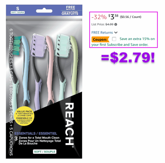 Reach Essentials Toothbrush with Toothbrush Caps, Multi-Zoned Angled Soft Bristles, Contoured Handle, Tongue Scraper, 6 Count for $3.98 (Reg $4.99)
