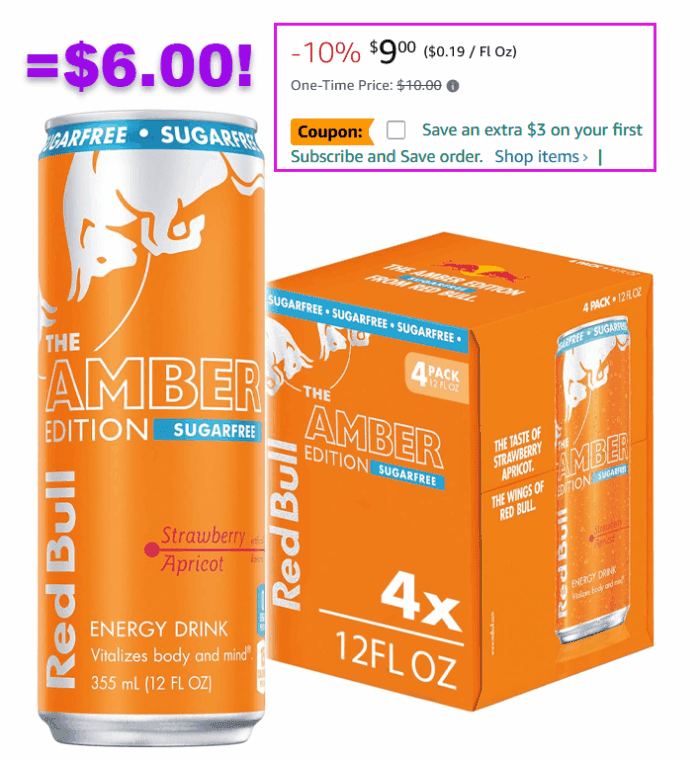 Red Bull Amber Edition Sugar Free Energy Drink, Strawberry Apricot, 12 Fl Oz, Pack of 4 Cans for $9 (Reg $10)!