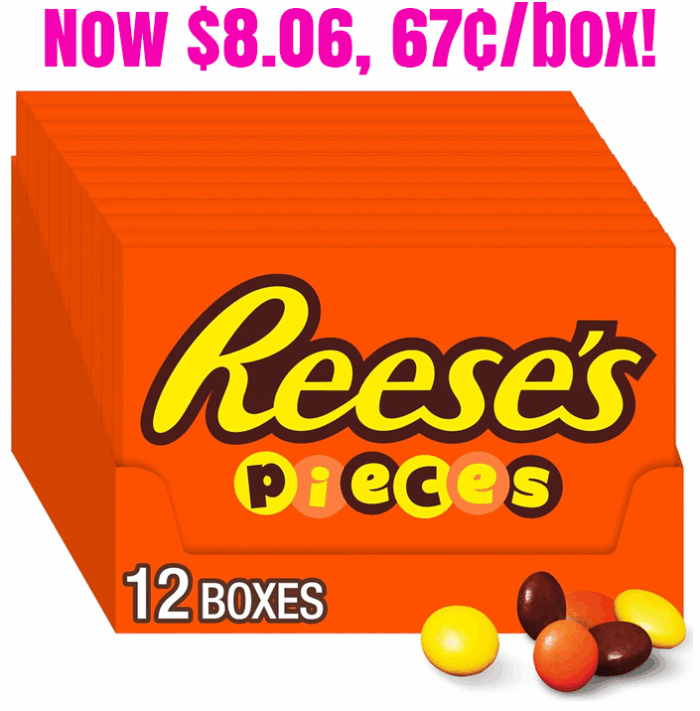 REESE’S PIECES Peanut Butter in a Crunchy Shell, Candy Boxes, 4 oz (12 Count) for $8.06 (Reg $14.88)