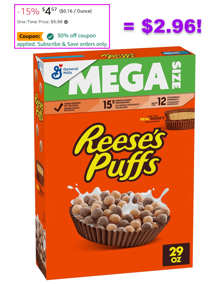 REESE’S PUFFS Chocolatey Peanut Butter Cereal, Mega Size, 29 oz for $5.38