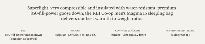 REI Co-op Magma 15 Sleeping Bag – Men’s $98.83 (reg $399.00)