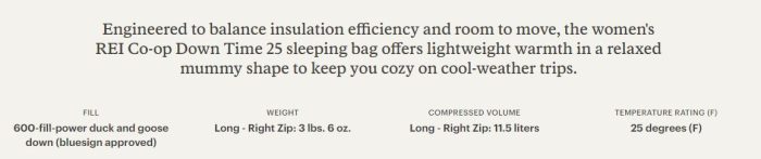 REI Co-op Down Time 25 Down Sleeping Bag – Women’s $56.83 (reg $229.00)